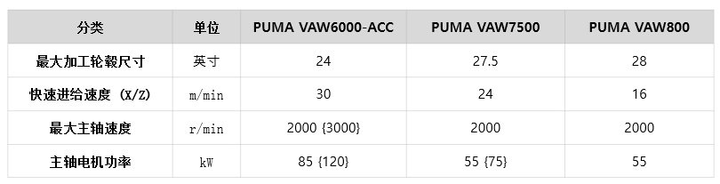 PUMA VAW 系列的PUMA VAW6000-ACC采用適合強勁切削性能、高于同級水平的大功率(120kW)、大扭矩(1279Nm)主軸,最大加工直徑為790mm,最大加工長度440mm,寬敞的加工范圍可以完成15’’~28’’等不同尺寸的鋁輪轂加工。